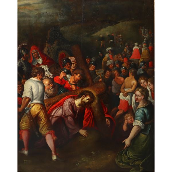 Here, in our work, we see the exact opposite of classicism. Indeed, we see an attitude on the part of the painter who painted the painting, of an absolutely manneristic type which corresponds with what we have noticed. The stylistic characters of our painting, therefore, are strictly connected with a another Flemish master working in southern Italy in the second half of the sixteenth century, Simone De Wobreck. It is a name that today may be less known than a de Vos, but Simone De Wobreck was a master of the highest prominence, active above all in Sicily where he created an important group of disciples and followers. If we compare our painting with an authentic c De Wobreck's masterpiece such as the majestic altarpiece of the Circumcision in the church of San Domenico in Castelvetrano is in my opinion clear that we are faced with the same hand. Analytical and pungent, very lively and proliferating, our painting was created by an artist of the same mentality and figurative culture that we see expressed in the Castelvetrano altarpiece. Furthermore, Simone De Wobreck repeatedly dealt with the theme of the Ascent to Calvary, as is well documented by at least two altarpieces that sources refer to him, one already in San Francesco in Caccamo and another in the church of Santa Maria Maddalena in Ciminna. In short, our painting must be considered a remarkable work of Flemish mannerism in Italy, probably dating back to between the ninth and tenth decades of the sixteenth century, in the last years of the life of De Wobreck who, born in Haarlem on an unspecified date but to be placed in the fourth decade, he disappeared, on a documentary basis, around 1596/97."