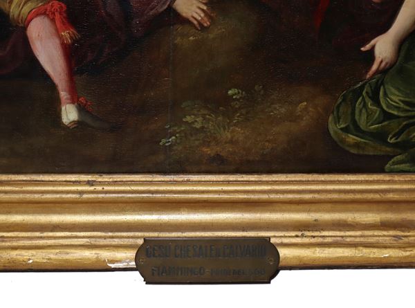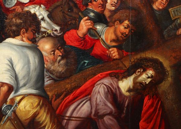 "The Ascent to Calvary bears the following words inscribed on the back (partially covered by a parquet presumably applied in fairly recent times to strengthen the stability of the wood): Martin de Vos Antwerp 1532-1603. Therefore the reference, which I believe was also written in recent times, is to the famous Flemish painter who was also present in Italy and left illustrious works as well as a flourishing workshop in our country. And precisely on this point it must be treated in relation to our painting. The work in question here, in fact, is absolutely Flemish and can be dated with absolute certainty to the second half of the sixteenth century, but it does not at all denote the style, however unmistakable, of Martin de Vos. On the contrary our work falls within a context of Flemish painting in Italy which does not derive directly from de Vos but instead coincides with a collateral but very distinct school of his fellow countrymen. Characteristic of our painting, examined here, is the swarm of characters who they crowd around the fallen Redeemer and reflect a double sentiment: ethical and aesthetic. On the one hand, upon closer inspection, the painter vigorously represents with harsh and almost popular accents the pain and sadness of the crowd that gathers and thins out with a very suggestive and engaging scenic effect; on the other hand, the work as a whole reads as a sense of derision and mockery, consistent with the story represented. This type of representation is typical of Flemish culture which even remotely remains connected, in many authors also active in Italy, to the culture of Hieronymus Bosch, dating back however to the first half of the sixteenth century.
