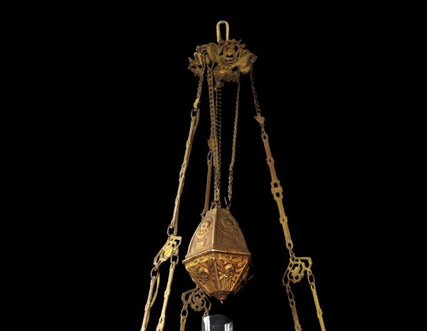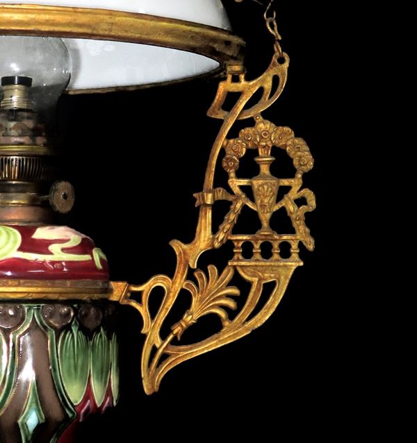 Electrified. Majolica painted in Art Nouveau style and white opaline diffuser, gilded bronze structure.