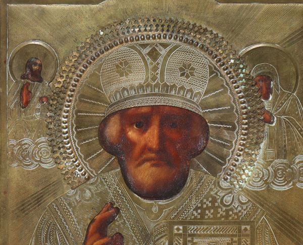 Russian icon depicting Saint Nicholas blessing with Christ and the Madonna at his sides, Late 19th century