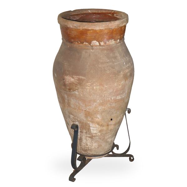 Terracotta jar with enamelled neck and iron base