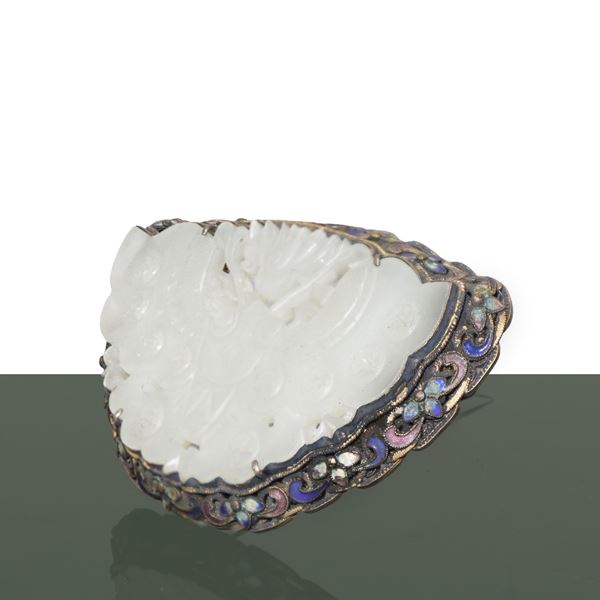 Chinese brooch in silver and white jade entirely hand-carved. Enamelled in blue, violets and light blue on the sides. "SILVER" written on the back.