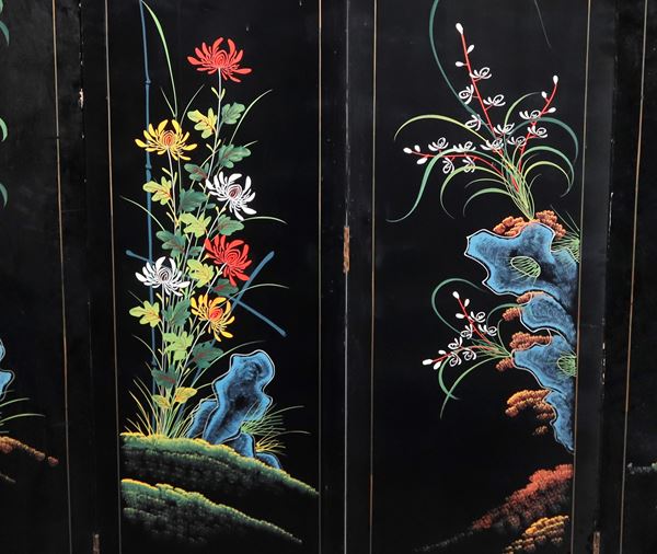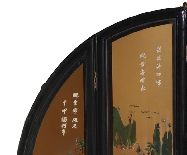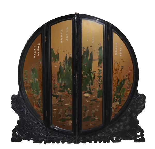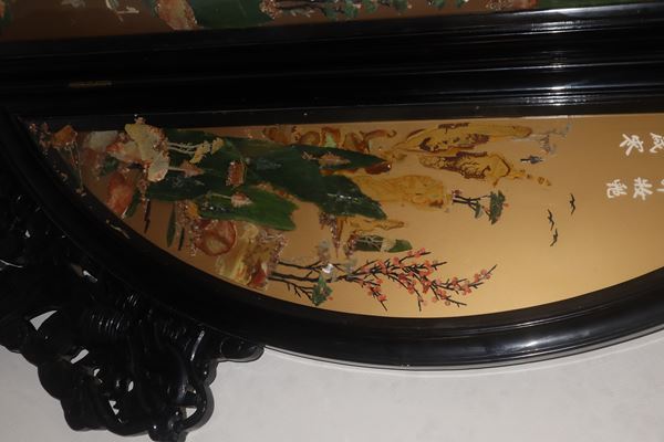 With application under glass of jades, carnelians, and pvarious stones with floral motifs. Back entirely hand painted. There are some necklines of the decorations.
