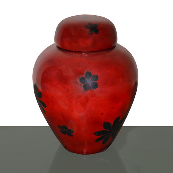 Pair of oriental wooden vases with lids, lacquered in red and with floral decorations in black.