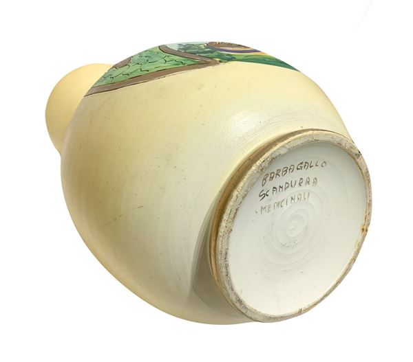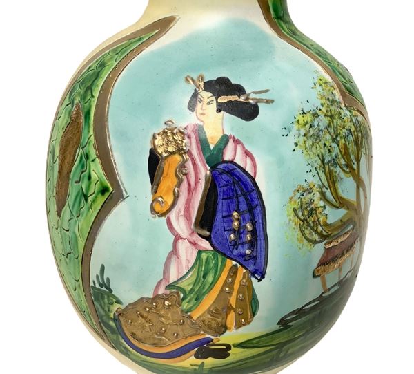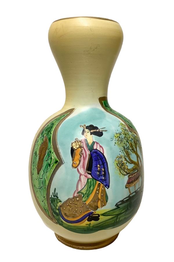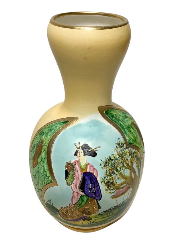 Pair of vases painted with Chinese genre scenes, gold inserts on a beige base.