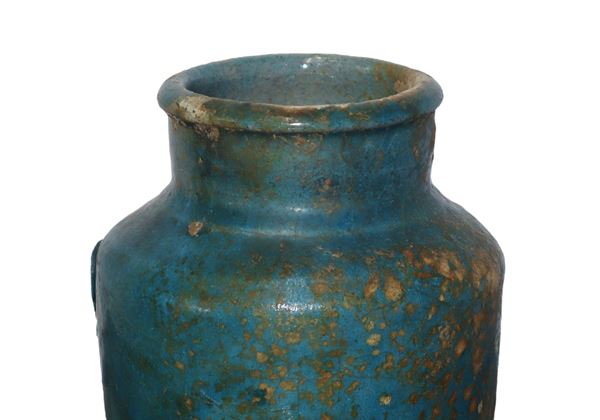 Small Persian ceramic albarello, with green glaze and traces of golden iridescent, Persia 12th-13th century
