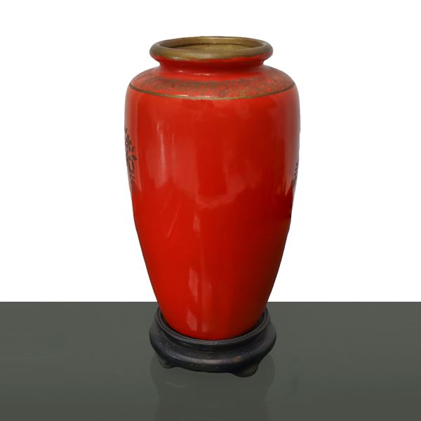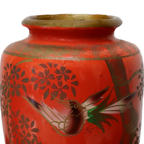 Chinese ceramic vase, red lacquered with bird and bamboo decorations
