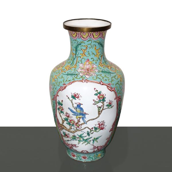 Chinese porcelain vase with aquamarine background, polychrome floral decorations and birds perched on branches.