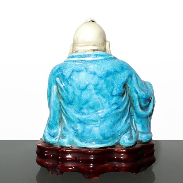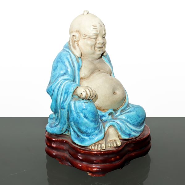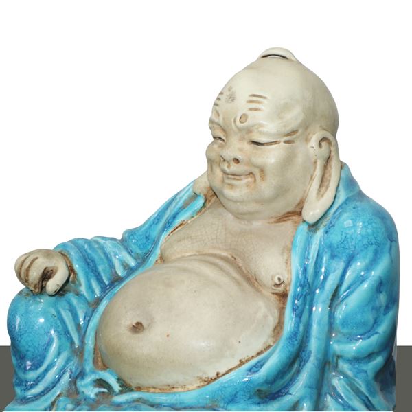 Laughing Pu-Tai Buddha in glazed ceramic in the colors of white and blue