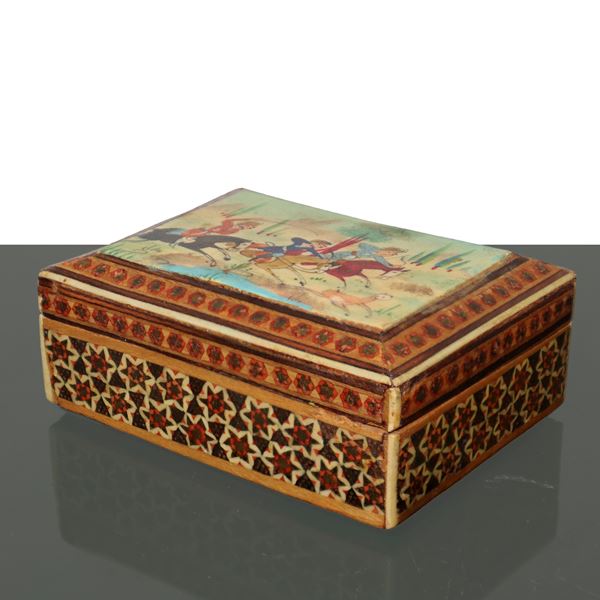 Oriental wooden box with lid. Hand painted with decorations in the colors of gold, red, white, black. Hunting scene painted on the lid, with three armed men on horseback and a gazelle-like animal. Colored spots inside the box.