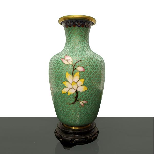 Pair of Chinese cloisonne vases with aquamarine background with pink and yellow flowers, gold decorations