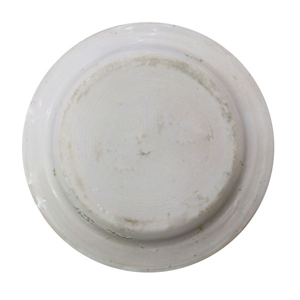 Caltagirone majolica plate sponged green and blue with floral motifs, manganese flower in the center, Mid 20th century