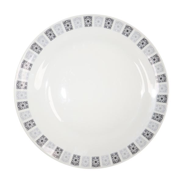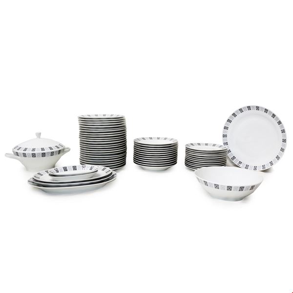 Consisting of 24 dinner plates, 12 soup plates, 12 dessert plates, 5 oval serving plates, a round serving plate, a soup tureen and a salad bowl.