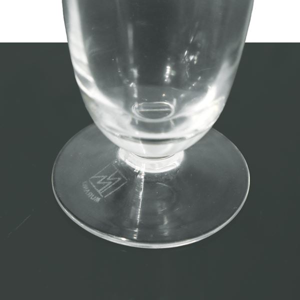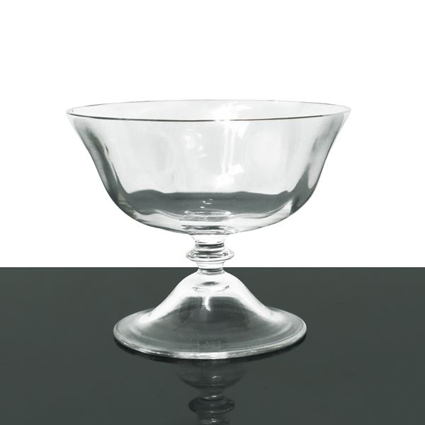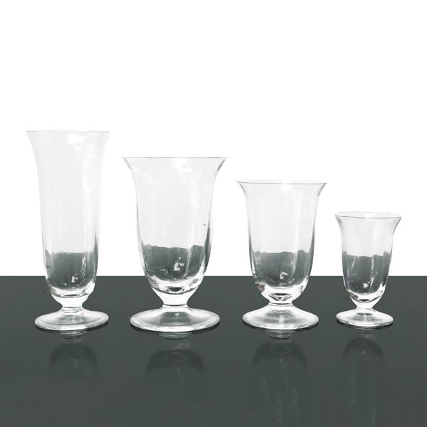Consisting of: 12 water glasses, 12 wine glasses, 12 flutes, 12 rosolio glasses, fruit salad bowl and 12 fruit salad bowls. Minimal chips on the fruit salad bowl.
