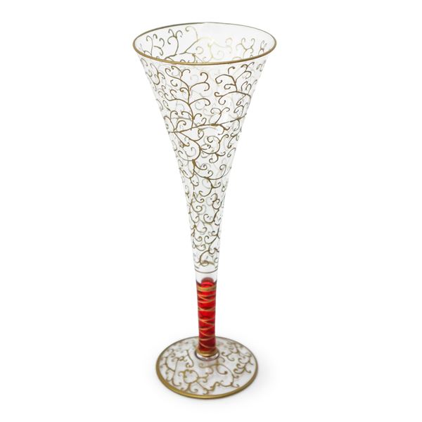 N. 6 Murano glass flutes with red and gold decorations, 20th century