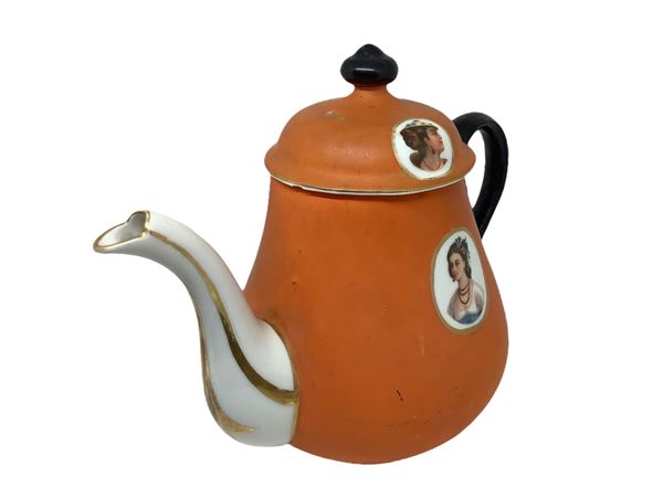 Porcelain coffee pot with ladies on the front and back and on the lid, 20th century