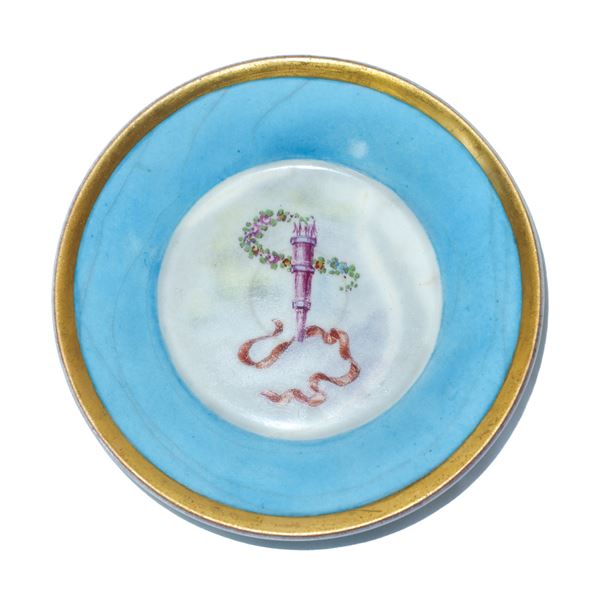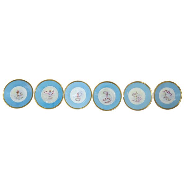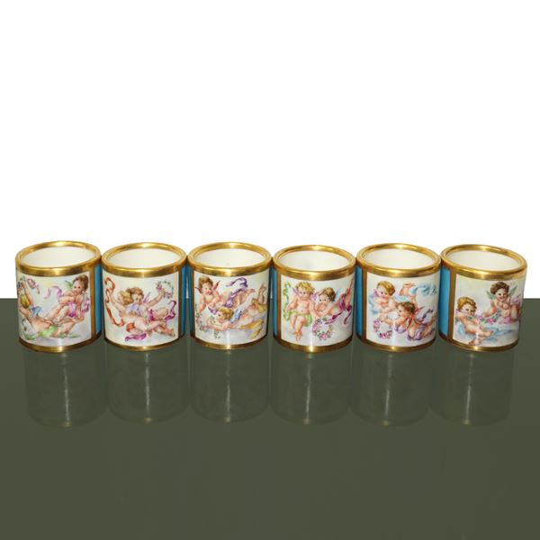 Sei tazzine con piattino in porcellana Sevres dipinte con putti