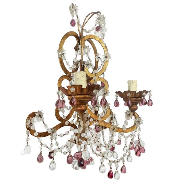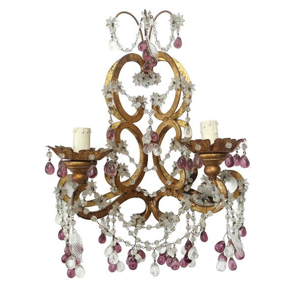 Two-light gold metal wall lamp with glass spheres and white and amethyst flowers