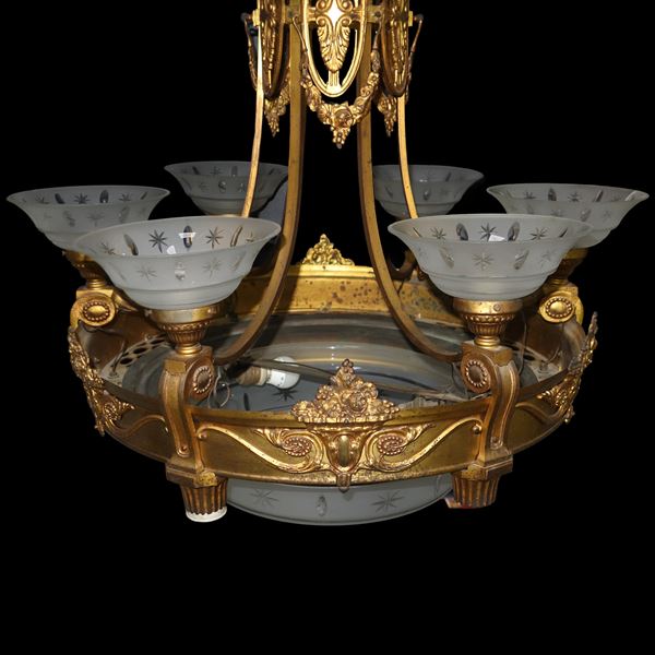 6-light chandelier with two central lights in gold metal with cut and carved glass cups, early 1900s