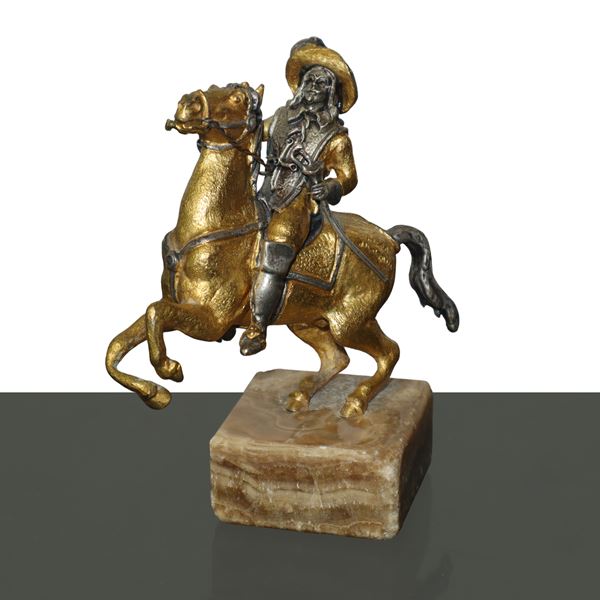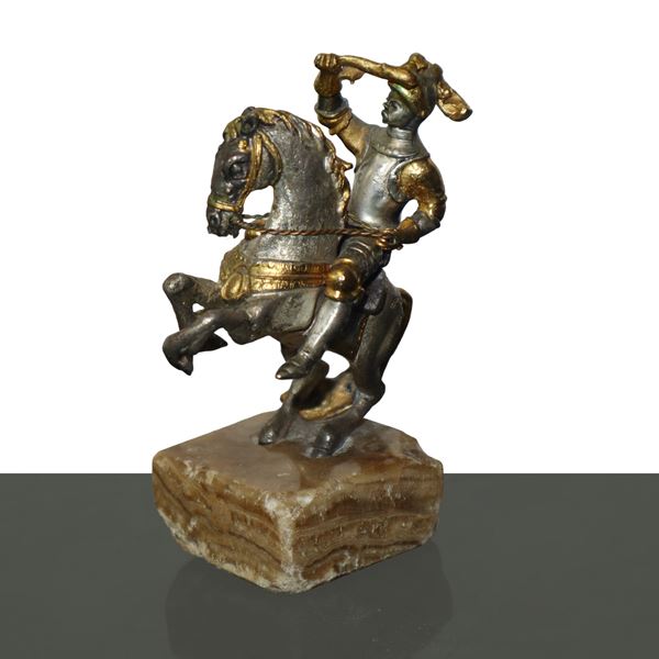 No. 3 small statues of knight on horseback in silvered and gilded bronze mounted on onyx base