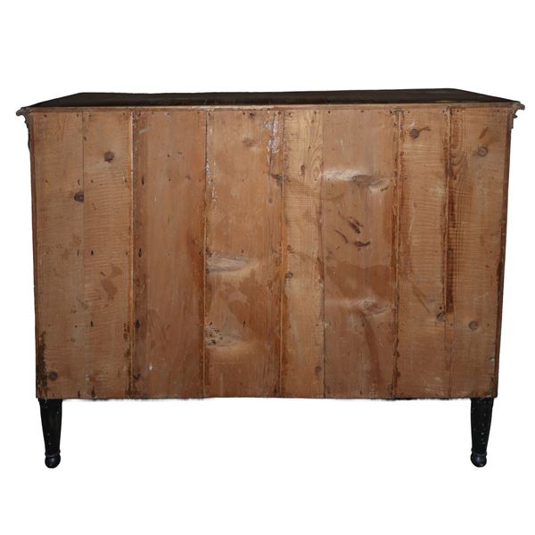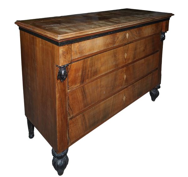 Chest of drawers with 4 drawers in mahogany feather with diamond-shaped mouthpieces, carved black ebonized wood heads applied to the sides, first half of the 19th century