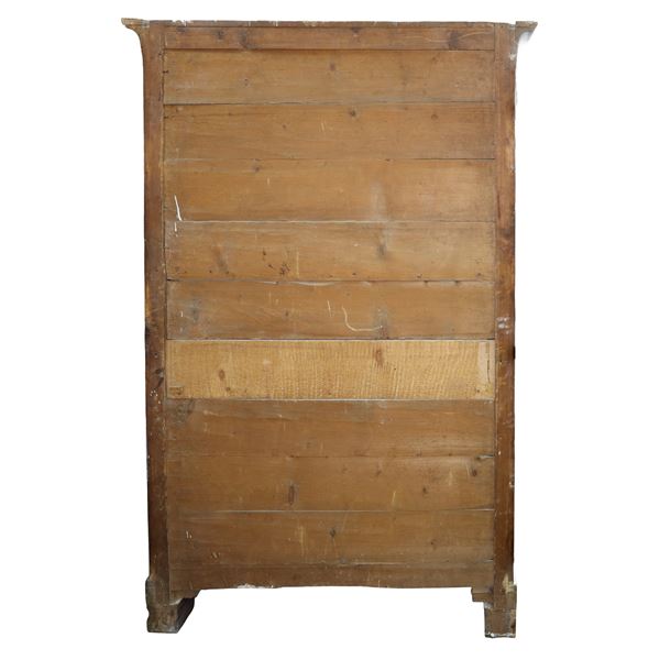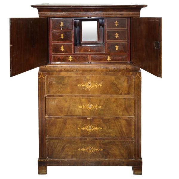 Hat with half-barrel frame, two doors underneath inside which drawers and central mirror. Four drawers at the bottom, single body.