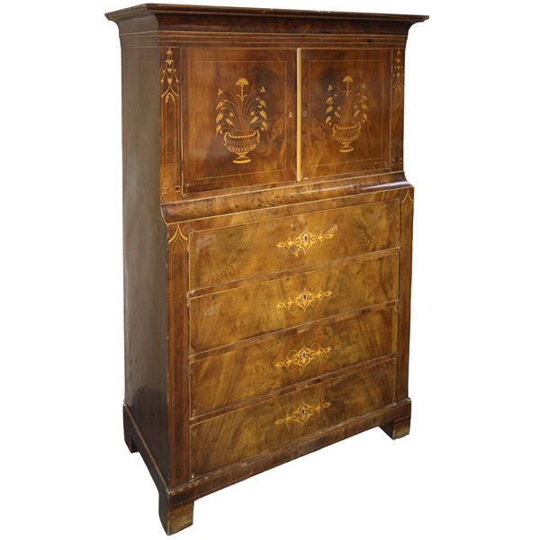 Chiffonier in mahogany wood with inlays on the front and filleted on the sides, Sicily 19th century