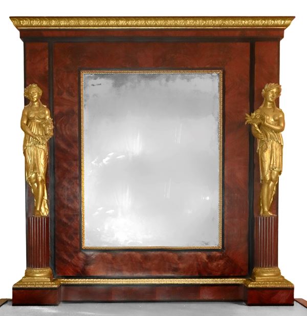 Marble recessed into the top, drawer under the top, column legs with gilded capitals joined by a crosspiece, pine cone feet with gold leaf inserts, 123 x 120 cm mirror with mercury glass and supporting lateral columns, gilded wood sculptures with leaf depicting female figures (seasons), gilded frames, mahogany feather wood