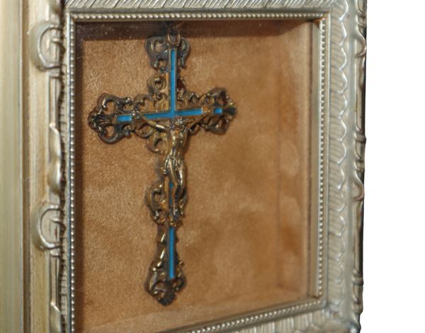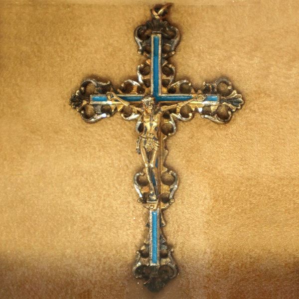 Crucifix in silver and gold metal with enamels, in a display case., 18th century