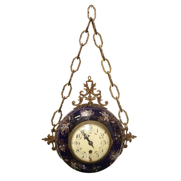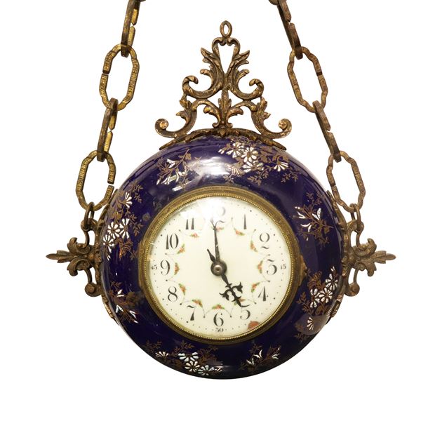 Double-sided wall clock in blue Sevres porcelain painted with floral motif enamels