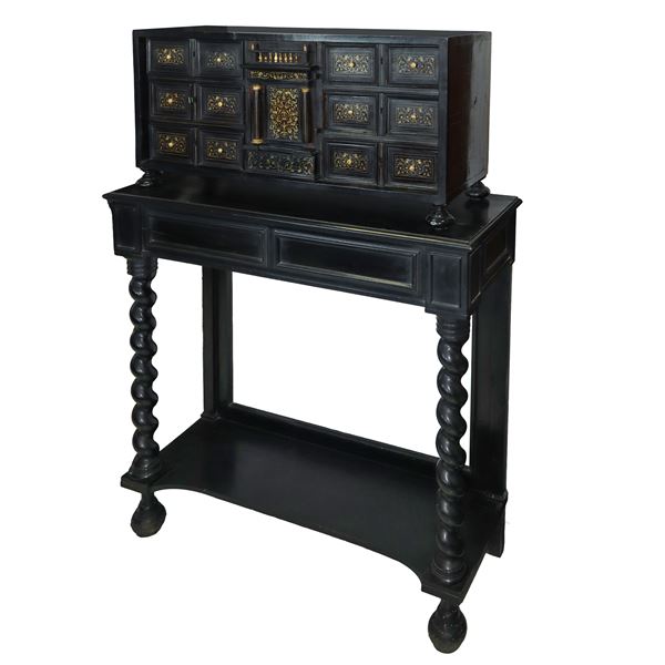 Ebonized wooden coin cabinet, 6 boxes per side., 18th century