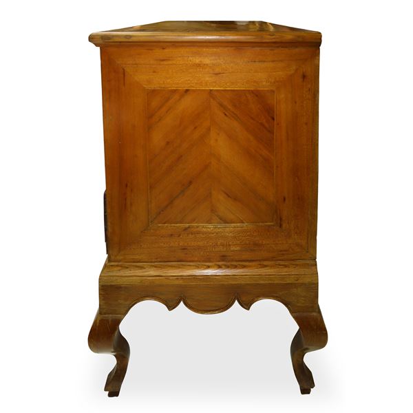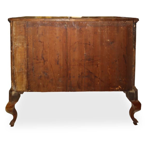 Top threaded in the center in light boxwood. Three drawers threaded in light boxwood, bronzes applied on the front. Valance at the base