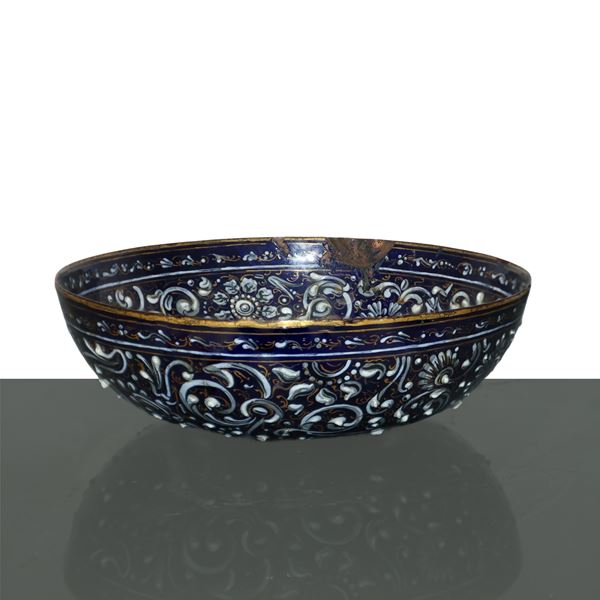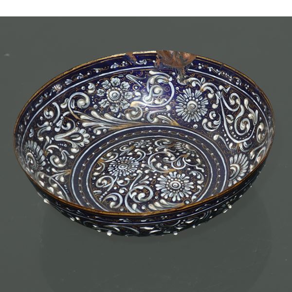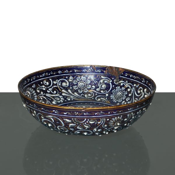 Renaissance motif bowl with cloisonnet enamels of thin gold threads on a blue base and white floral enamels applied on copper, 15th/16th century