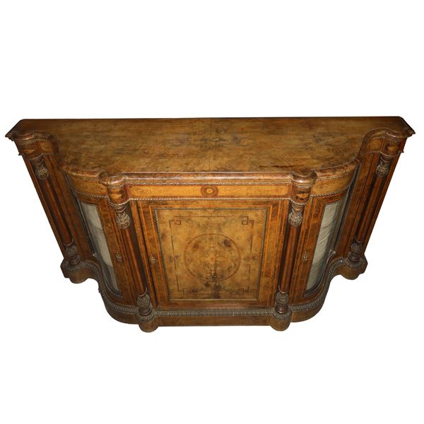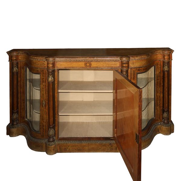 Low Victorian sideboard with central door, curved glass doors on the sides in walnut burl, England 19th century