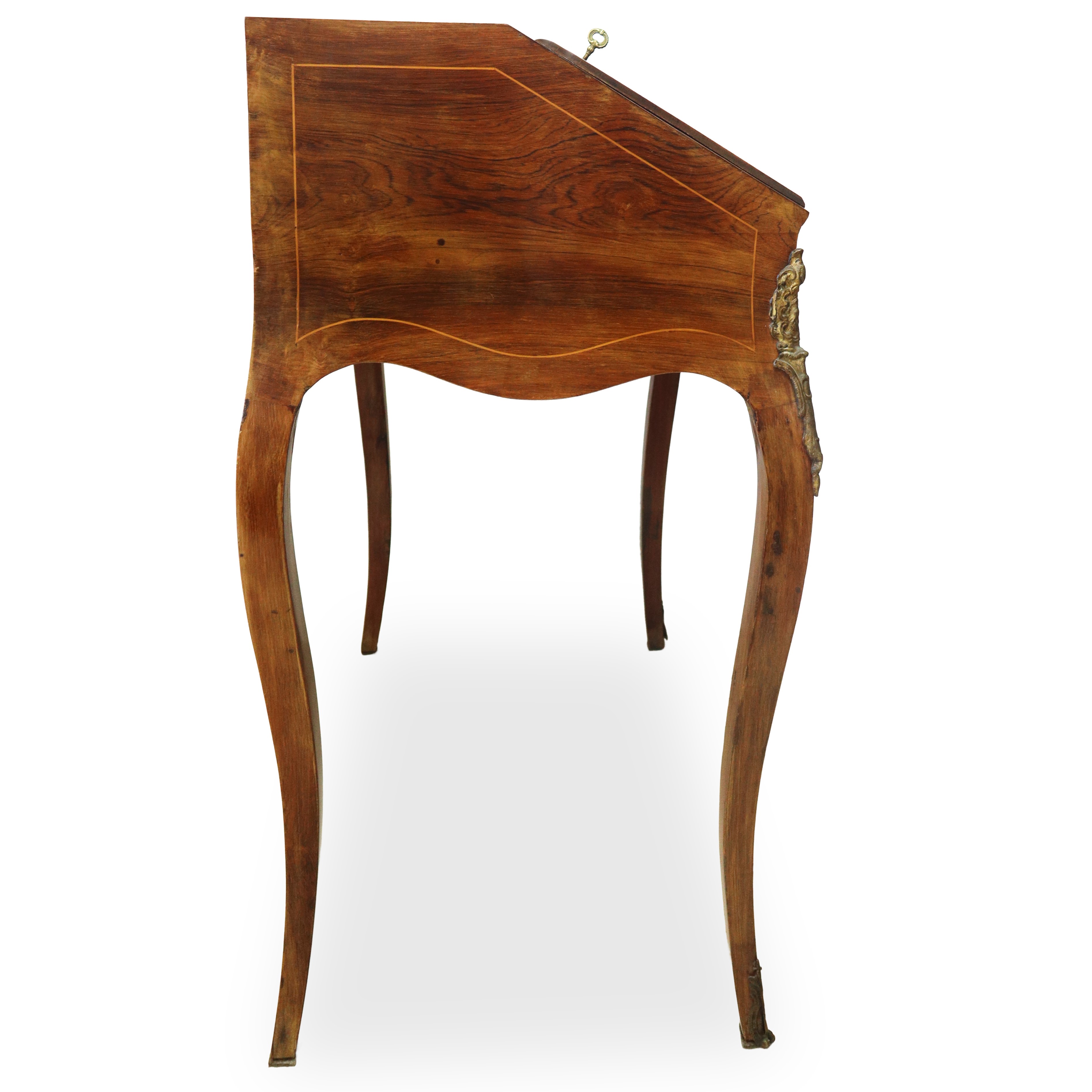Mahogany desk with oblique flap with floral motif inlays in light woods with bronzes on the legs, France 19th century