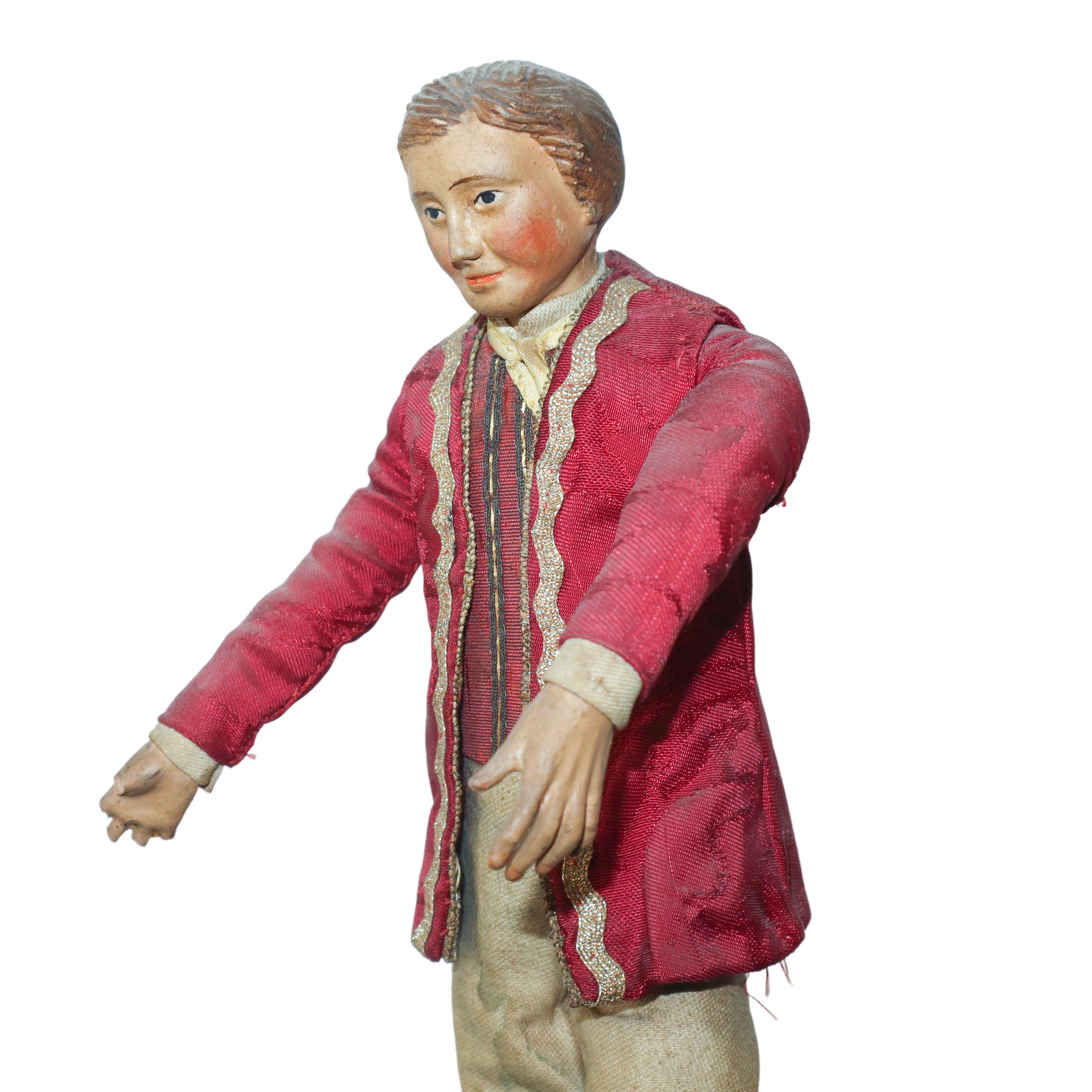 Nativity scene character in terracotta and wood with cotton, satin and trimmings clothes: young nobleman, Naples 19th century