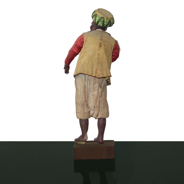 Nativity scene character in terracotta and wood with cotton, satin and trimmings clothes: dark-haired servant with turban, Naples 19th century