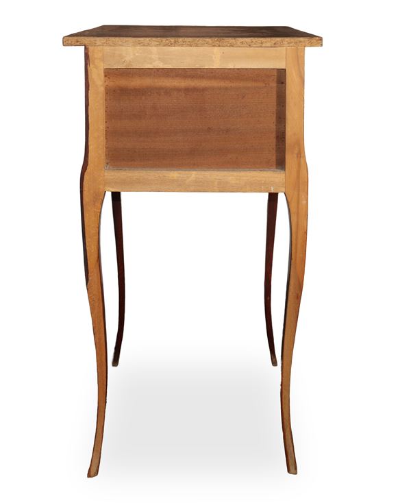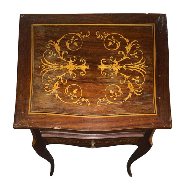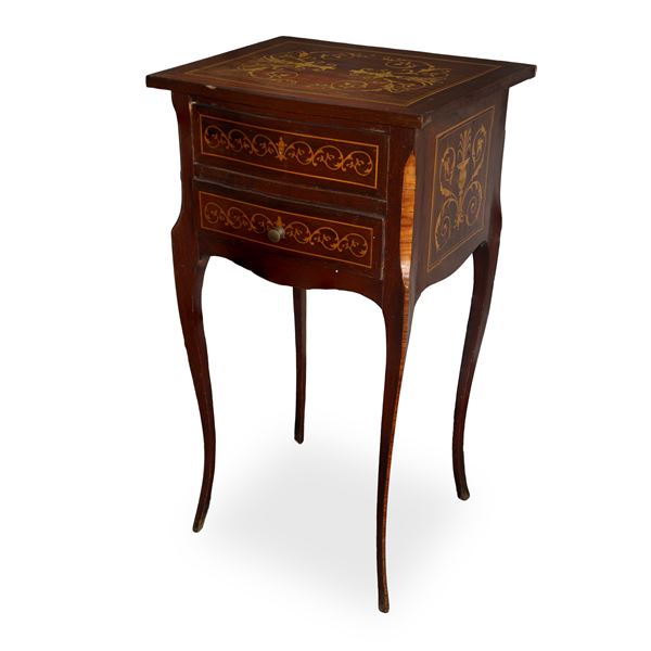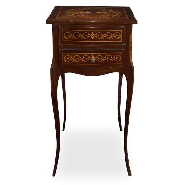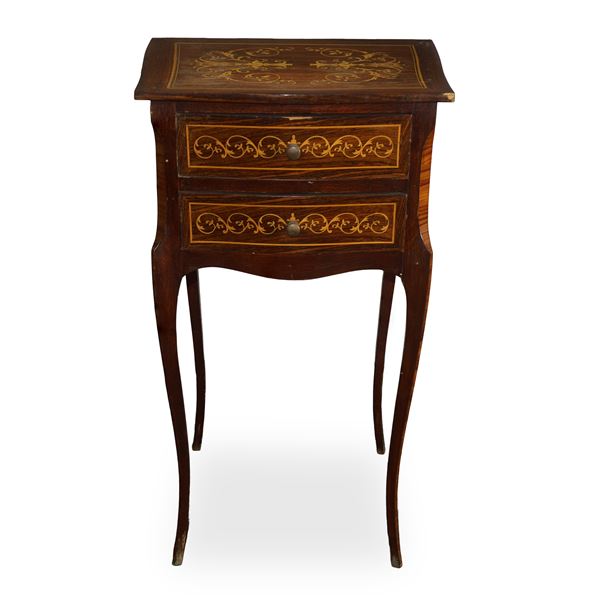 Pair of inlaid rosewood and boxwood bedside tables with two drawers, 20th century
