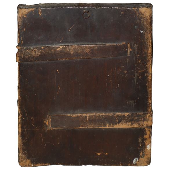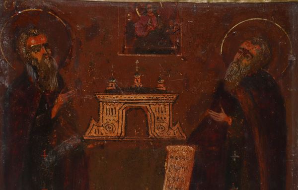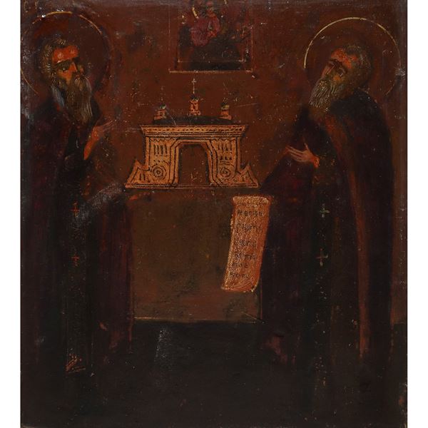 Russian icon with praying saints with engraved and embossed brass frame, late 18th century