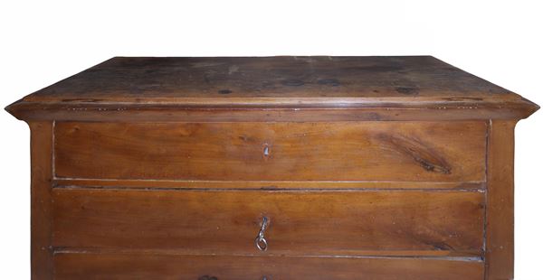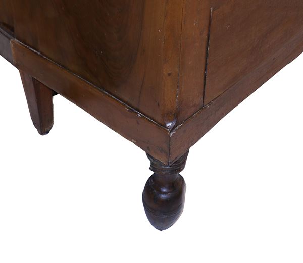 Walnut chest of drawers with 4 drawers, pine cone shaped front feet, truncated pyramid shaped rear feet and rounded corners, Sicily 1st quarter 19th century