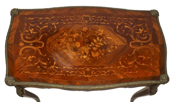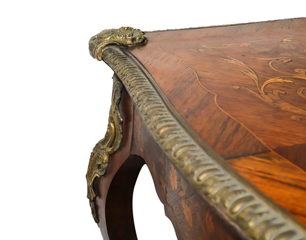 Central drawer, four legs, bronzes applied to the frames and legs. Inlays on the top and in the perimeter flounces.