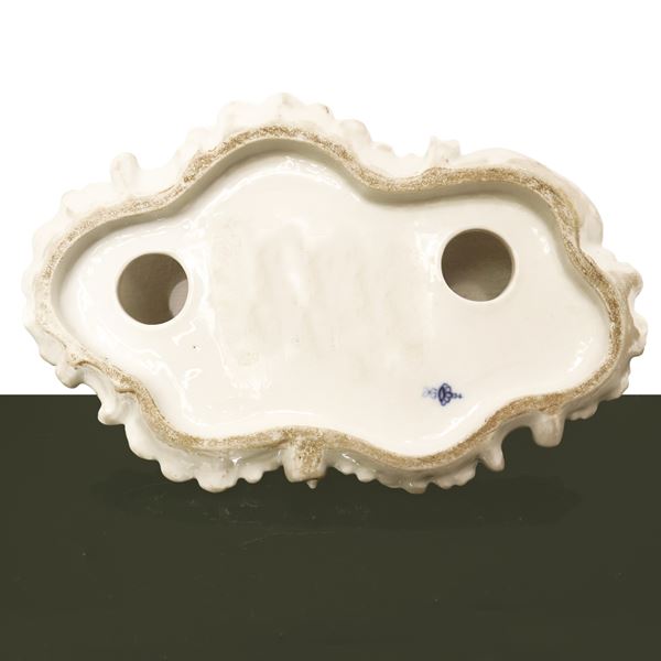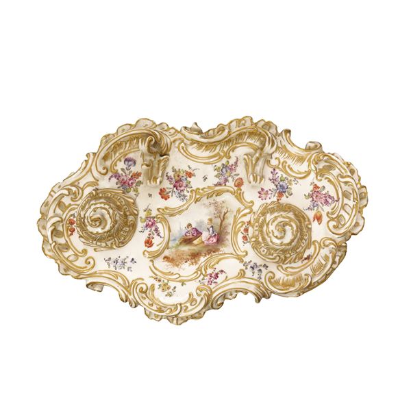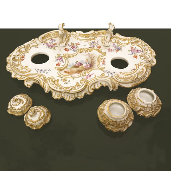 Inkwell with golden decorations, floral decorations and genre scene in the center