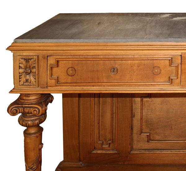 Console in walnut wood, grey Bardiglio marble on the top, two drawers under the top and tapered column feet, late 19th century