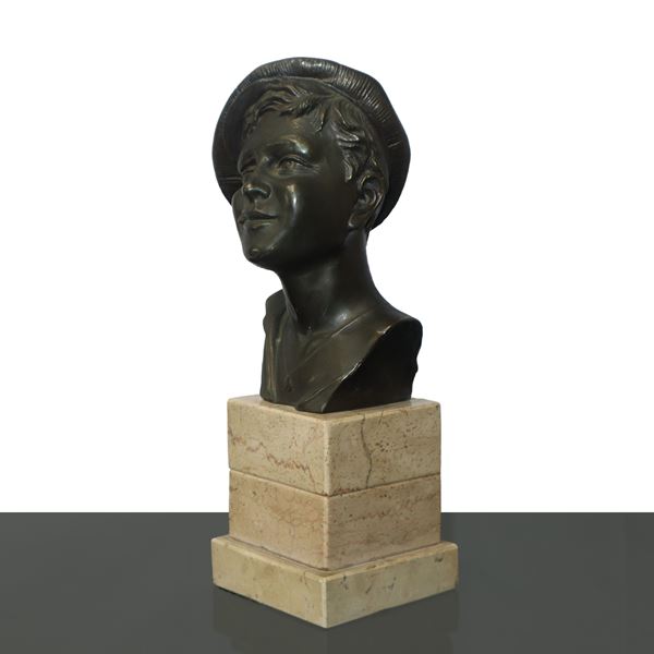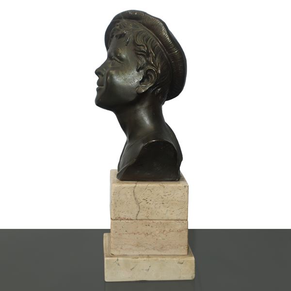 Bronze head of a young man with a beret winking, 20th century