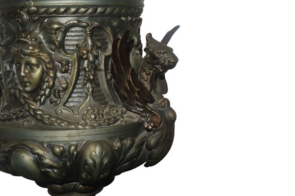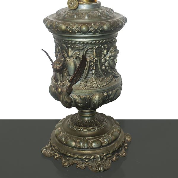 Lamp with metal base with embossed Gorgona figures in neo-Renaissance style. Glass diffuser painted with acanthus leaves, 19th century