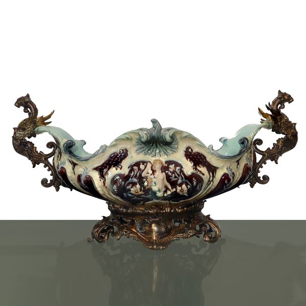 Large majolica centrepiece with metal base and handles with griffin depictions, late 19th century