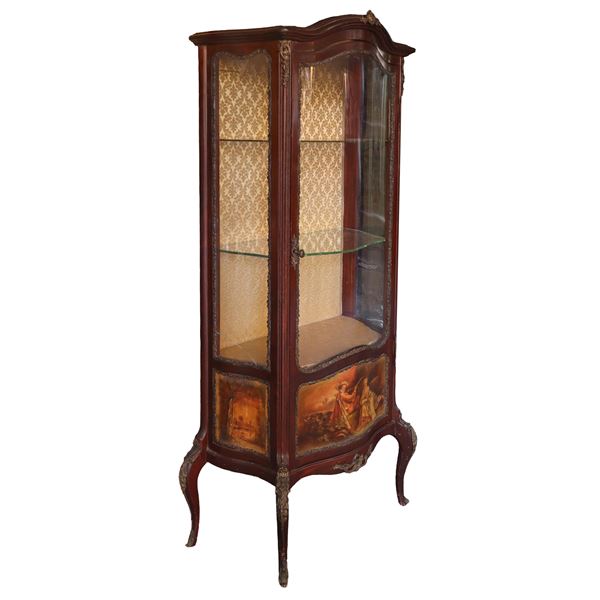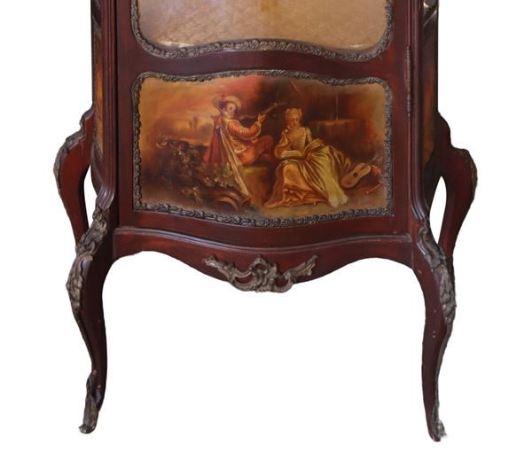 Domed glass door and sides, bronzes applied to the edges, painted base with gallant genre scenes, cabriole feet. Left corner glass broken