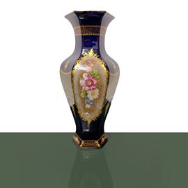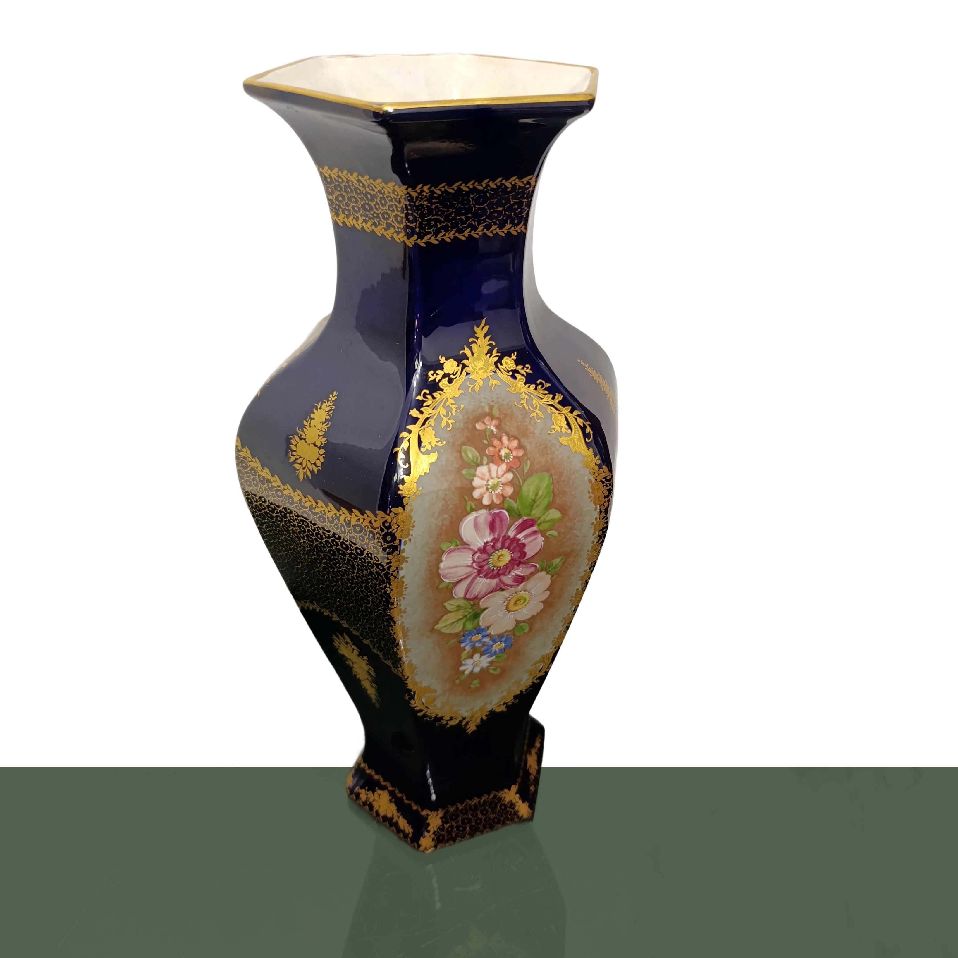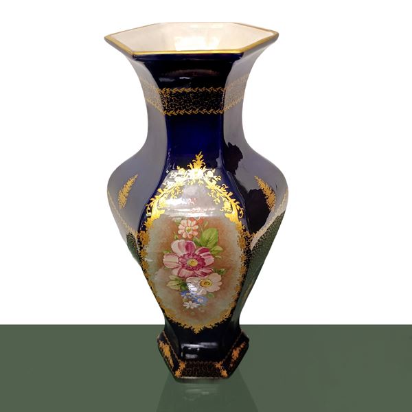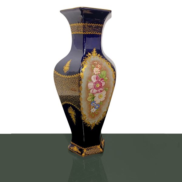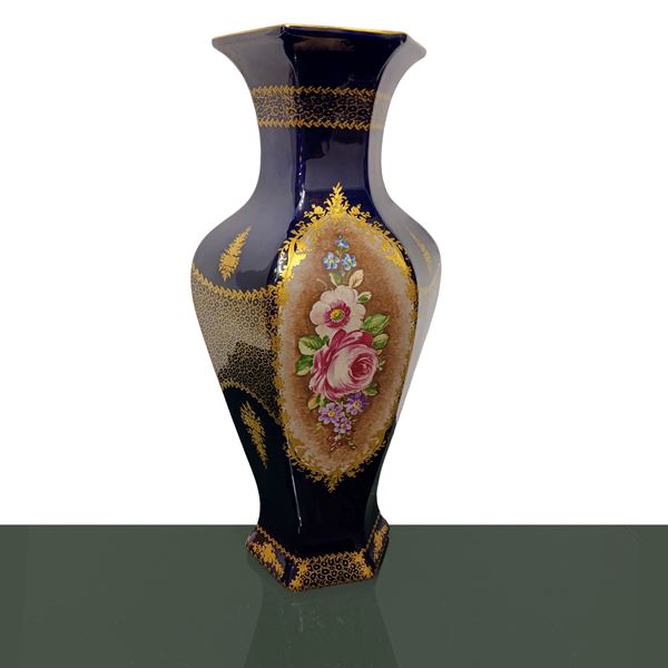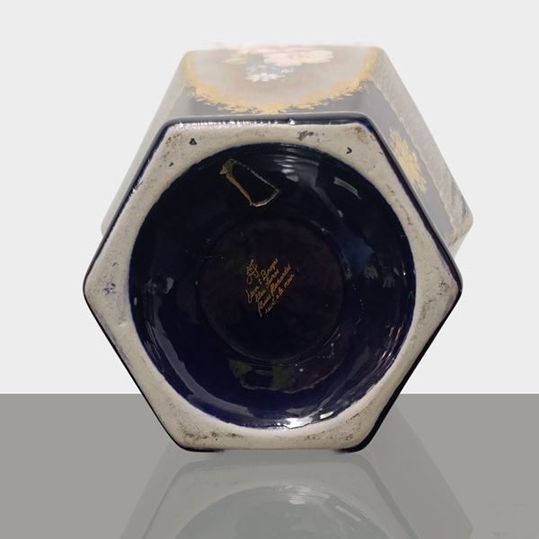 Pair of Sevres blue hexagonal vases with hand painted floral decorations, France 20th century