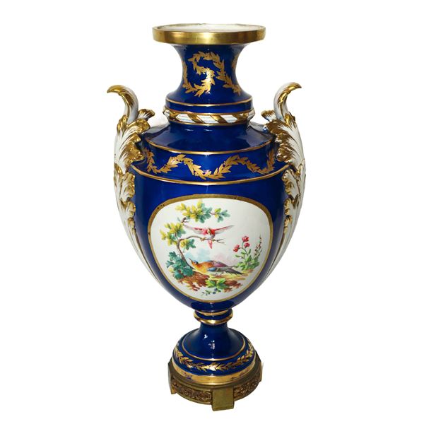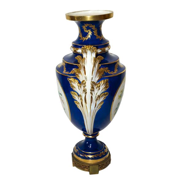 PORCELAIN VASE PAINTED WITH FLORAL MOTIFS WITH LEAF-SHAPED HANDLES, OLD FRANCE 19th CENTURY