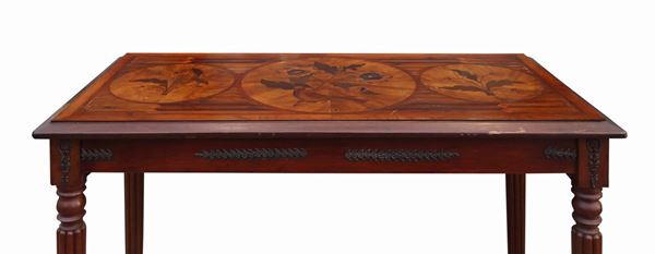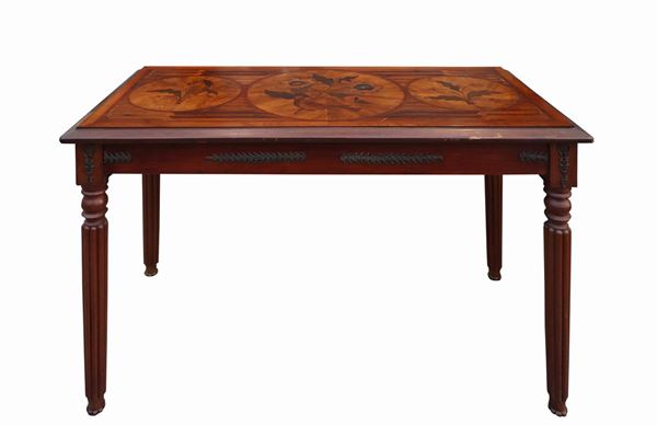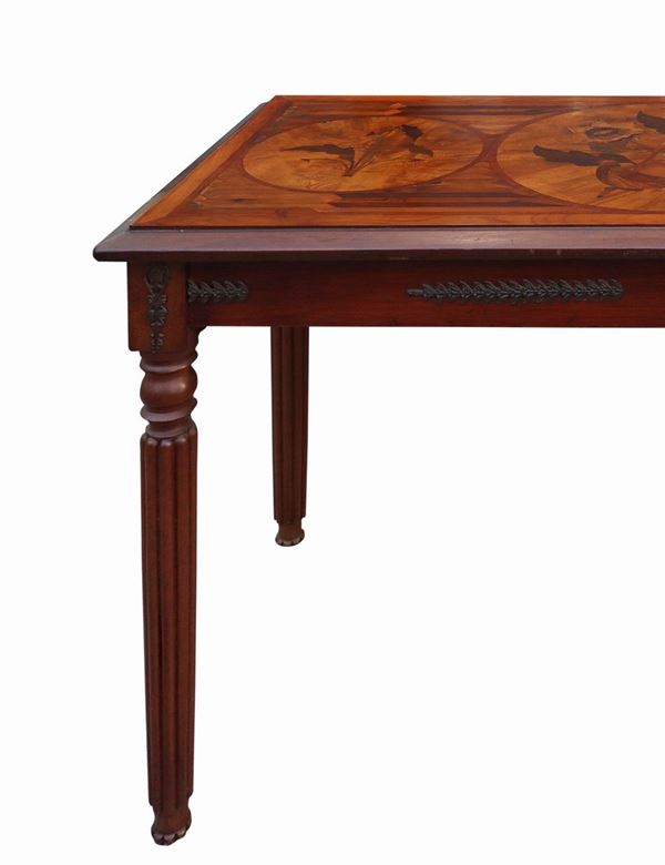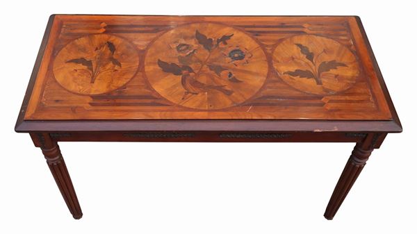 Inlaid top with floral motifs in various woods, rosewood, mahogany